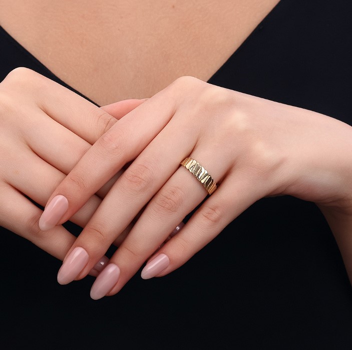 Deze verfijnde gouden damesring is een waar meesterwerk, vervaardigd uit hoogwaardig 14 karaats goud en ontworpen om zowel elegantie als stijl te uitstralen. Het golvende fantasiepatroon geeft de ring een unieke uitstraling, met een subtiele textuur die licht vangt bij elke beweging.