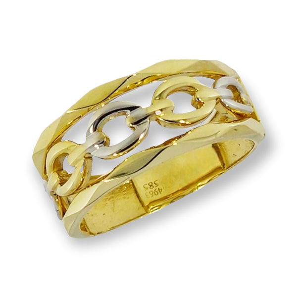 De Gouden Damesring Fantasie heeft een breedte van 9.5 mm, wat zorgt voor een opvallende en statement look. Het gepolijste oppervlak geeft de ring een stralende afwerking, waardoor deze echt opvalt om uw vinger.