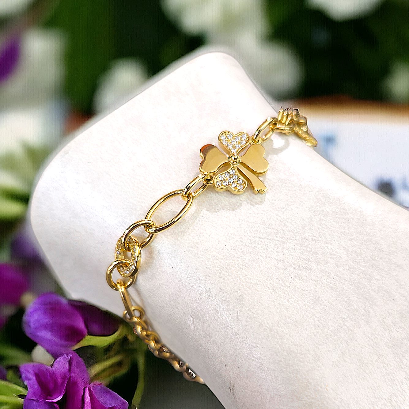 De armband wordt gesierd door twee schitterende bedels die elk een eigen verhaal vertellen. Het prachtig vormgegeven klavertje vier staat symbool voor geluk en voorspoed, terwijl de delicate vlinder transformatie en vreugde vertegenwoordigt. Beide bedels, samen met een deel van de fantasieschakel, zijn rijkelijk ingezet met fonkelende zirkonia’s die het licht bij elke beweging vangen en voor een adembenemende schittering zorgen.