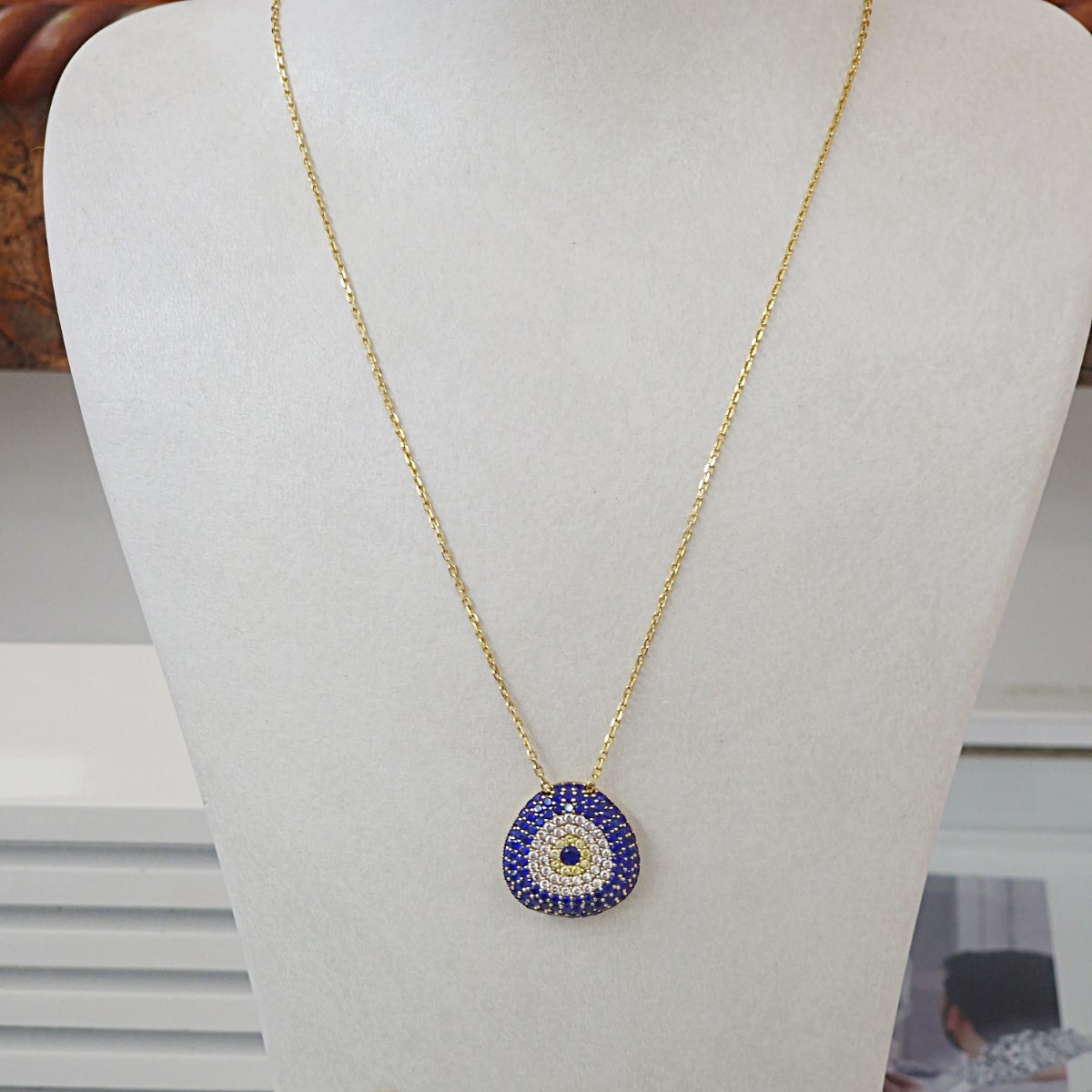 Het oog is met oog voor detail vervaardigd en prachtig ingelegd in diepblauwe en helderwitte tinten. Een stralende krans van fonkelende zirkonia’s omringt de hanger, waardoor het licht bij elke beweging wordt gevangen en een subtiele, luxueuze schittering ontstaat. De hanger hangt aan een delicate, maar sterke gouden ketting die comfortabel op de huid ligt.