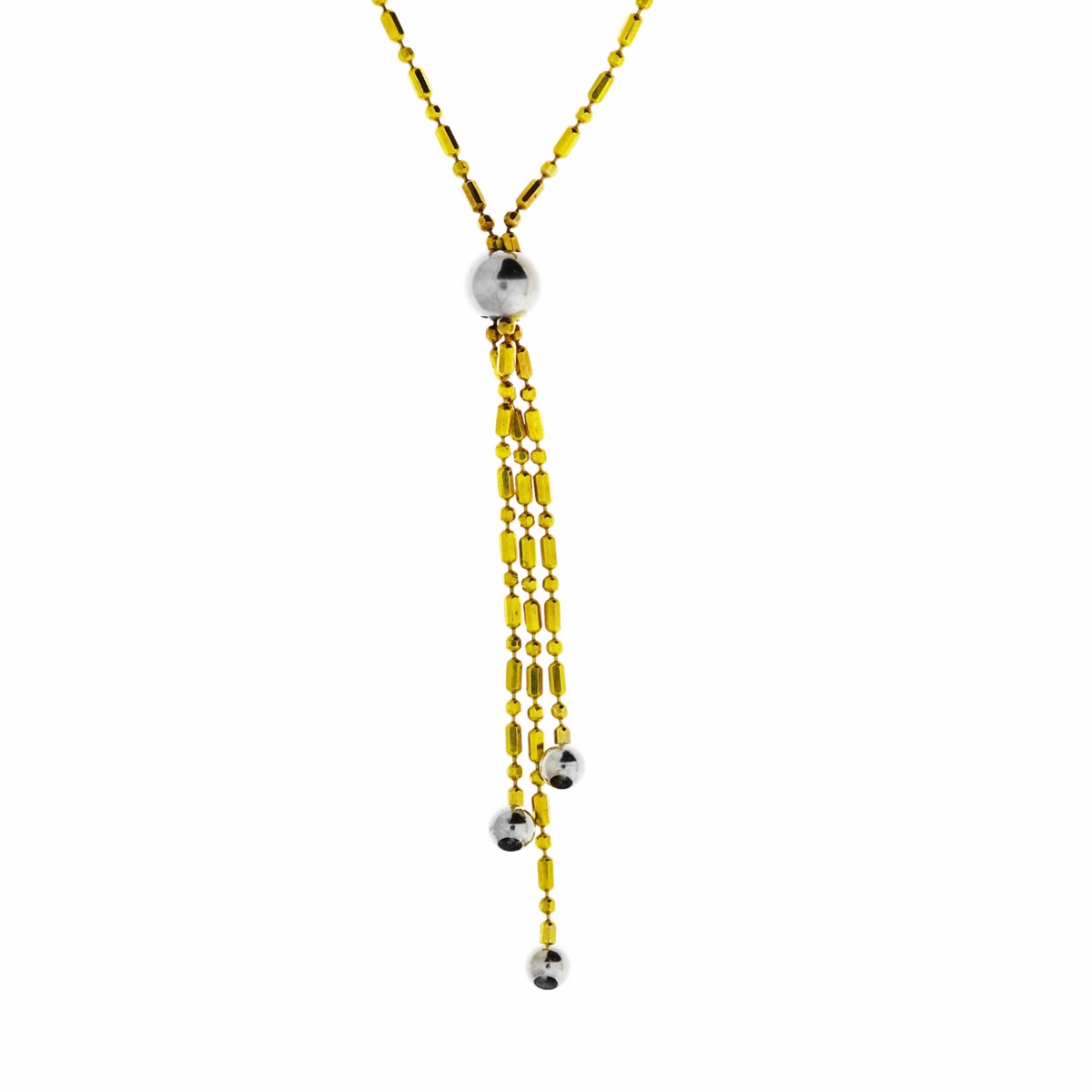 Deze prachtige Y-ketting is het ultieme accessoire voor de modebewuste vrouw. Het ontwerp combineert op meesterlijke wijze de warme gloed van goudkleurige, verfijnde schakels met de koele, heldere glans van zilverkleurige, gepolijste bollen. Dit stijlvolle bicolor-effect maakt de ketting ongelooflijk veelzijdig en moeiteloos te combineren met zowel je gouden als zilveren sieraden.
