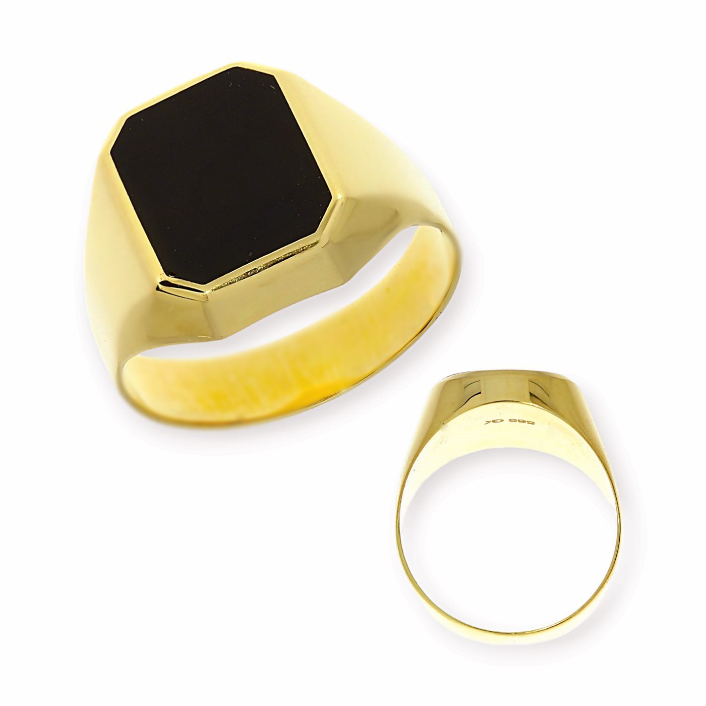 Deze afbeelding toont een klassieke gouden zegelring, gemaakt van 14-karaats goud. De ring heeft een eenvoudige, maar verfijnde uitstraling met een achthoekige zwarte onyx steen als centrale focus. Het gladde en minimalistische ontwerp benadrukt de tijdloze elegantie van de ring. De gladde goudband loopt taps toe naar de achterkant, wat zorgt voor comfort en een verfijnde look. Deze ring is ideaal voor wie houdt van een ingetogen en klassieke stijl.